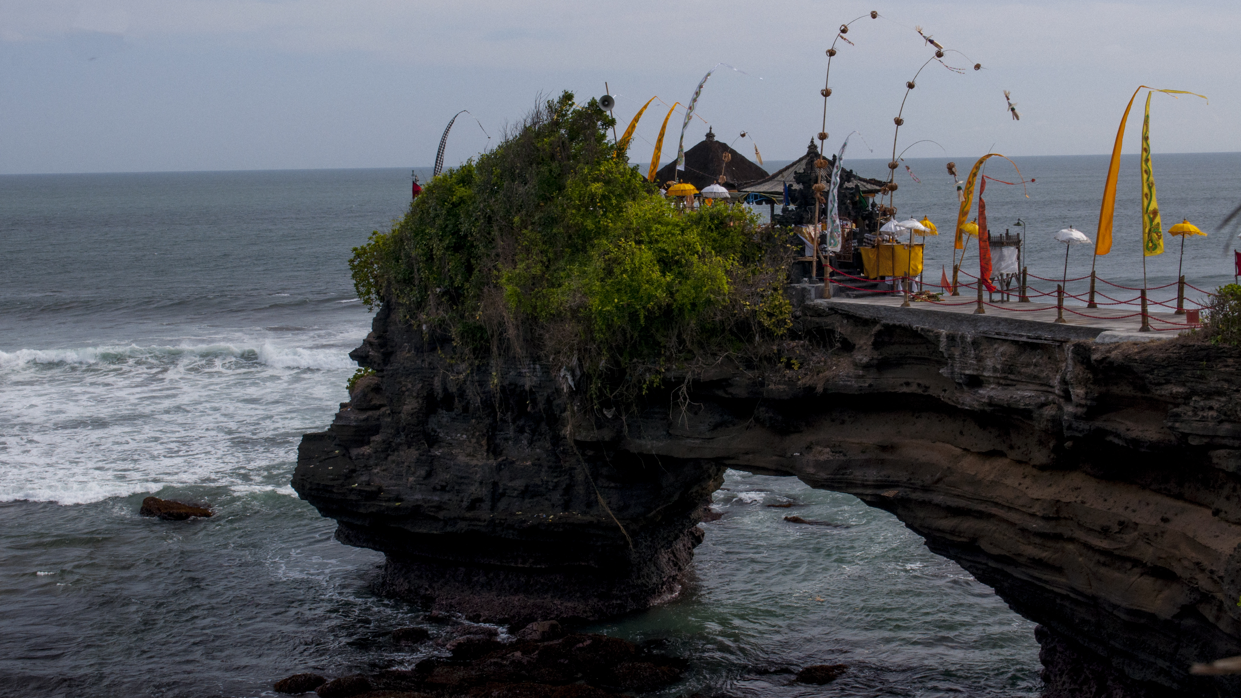 There is a fee per car at the Tanah Lot parking lot and then a per person entry fee (of Rp20,000 per adult and half that per child) to access the site of the temple. Having made your way through the gates there’s about a kilometre of stores selling the usual Bali knick-knacks that you will need to negotiate before you reach the coast and the temple reveals itself to you.
